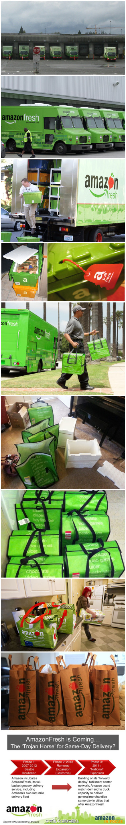 亞馬遜美國(guó)生鮮物流配送全過(guò)程圖片:➊冷藏車(chē)直接從冷庫(kù)對(duì)接;➋每個(gè)冷藏車(chē)都內(nèi)置貨架,貨架上存放每個(gè)訂單組合商品;➌每箱有獨(dú)立的封箱標(biāo)簽追蹤識(shí)別;➍單個(gè)訂單有獨(dú)立的保溫袋裝,內(nèi)置內(nèi)藏冰袋...據(jù)亞馬遜宣布,2014年將在全美擴(kuò)張生鮮…